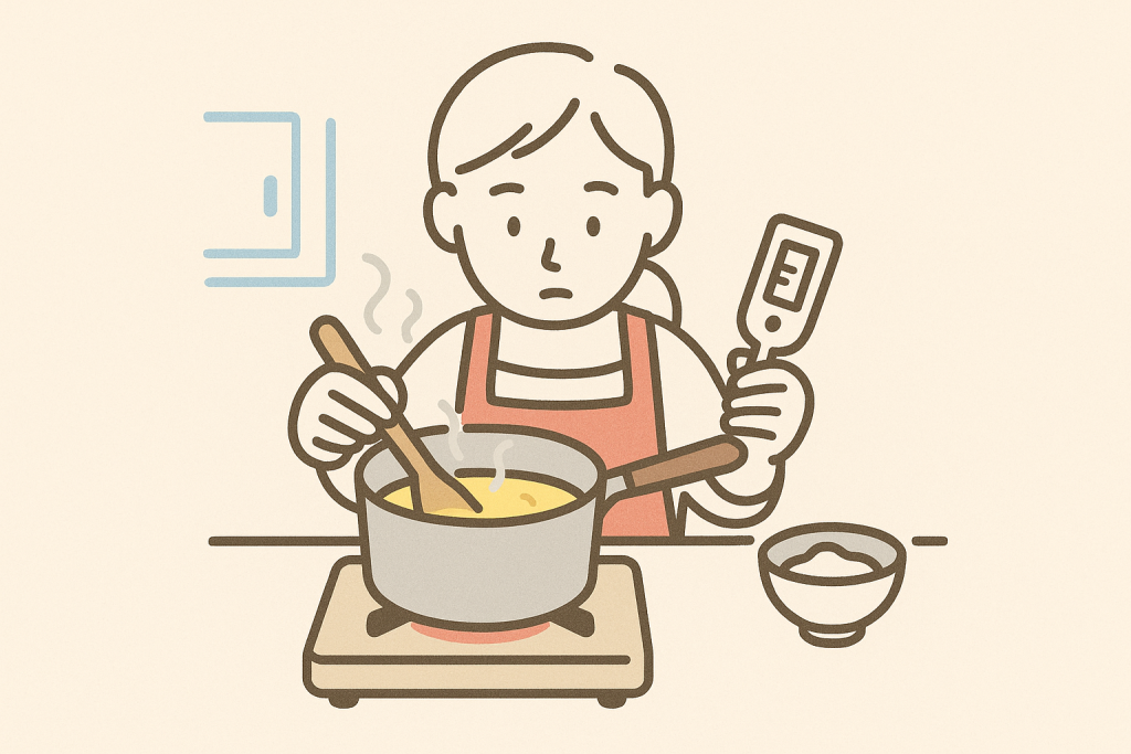 成功のカギは、材料をきっちり計量し、牛乳や卵の温度も整えること。粉類が少なすぎたり、卵が冷えすぎていたりすると、とろみが出づらくなります。常温に戻す、もしくは湯煎で軽く温めるとベストです。